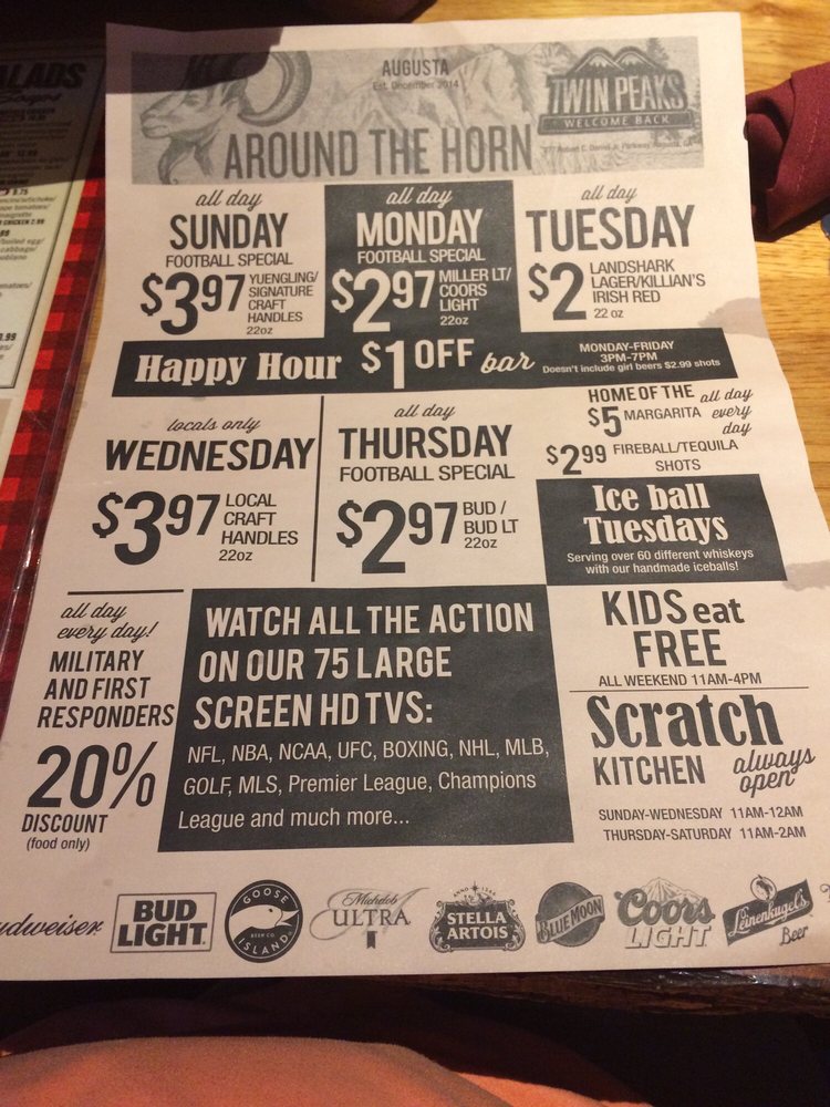 Compliment your meal with vibrant cocktails during happy hour, while enjoying the lively ambiance with friends. Twin Peaks GA delivers an unforgettable dining experience filled with flavor, fun, and fantastic service!